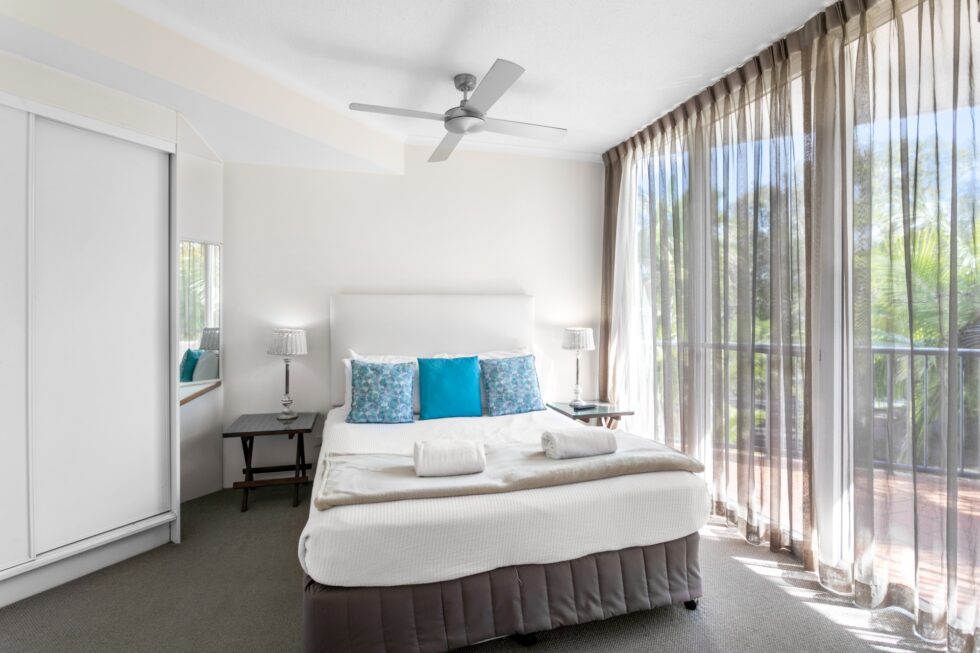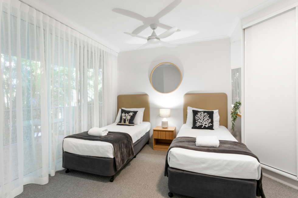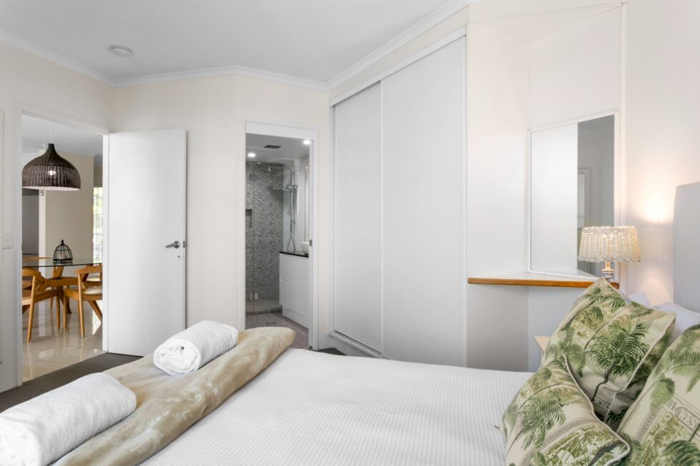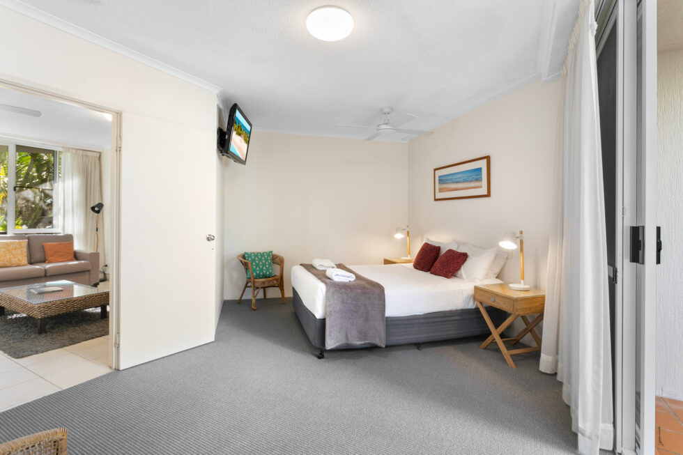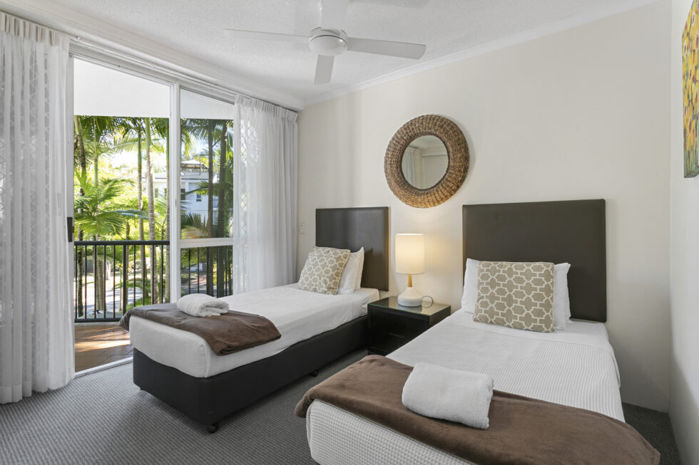 Our Noosa Three Bedroom self contained apartments feature a master bedroom with Queen sized bed and private ensuite. The second bedroom has a Queen sized bed and is serviced by a second bathroom. The third room offers two single beds and are suitable for a maximum of 6 guests.